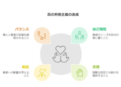 1. 利他の本質 ⚫︎利他とは、相⼿が⽬標を達成するために⾃分が尽⼒し、協⼒することを指します。 ⚫︎⾃分が困難な状況にあっても、全⼒で⽀える覚悟が … 続きを読む 利他の本質と優しさの誤解
